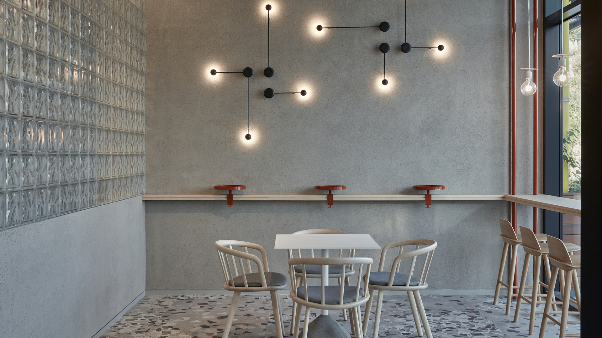 To have a variety of seating options - from bar stools to freestanding tables and chairs that can be pulled together for larger groups as well as a sofa and a purpose-built banquette — combined with distinctive hints of colour, gently disrupt the overall minimalist aesthetic.