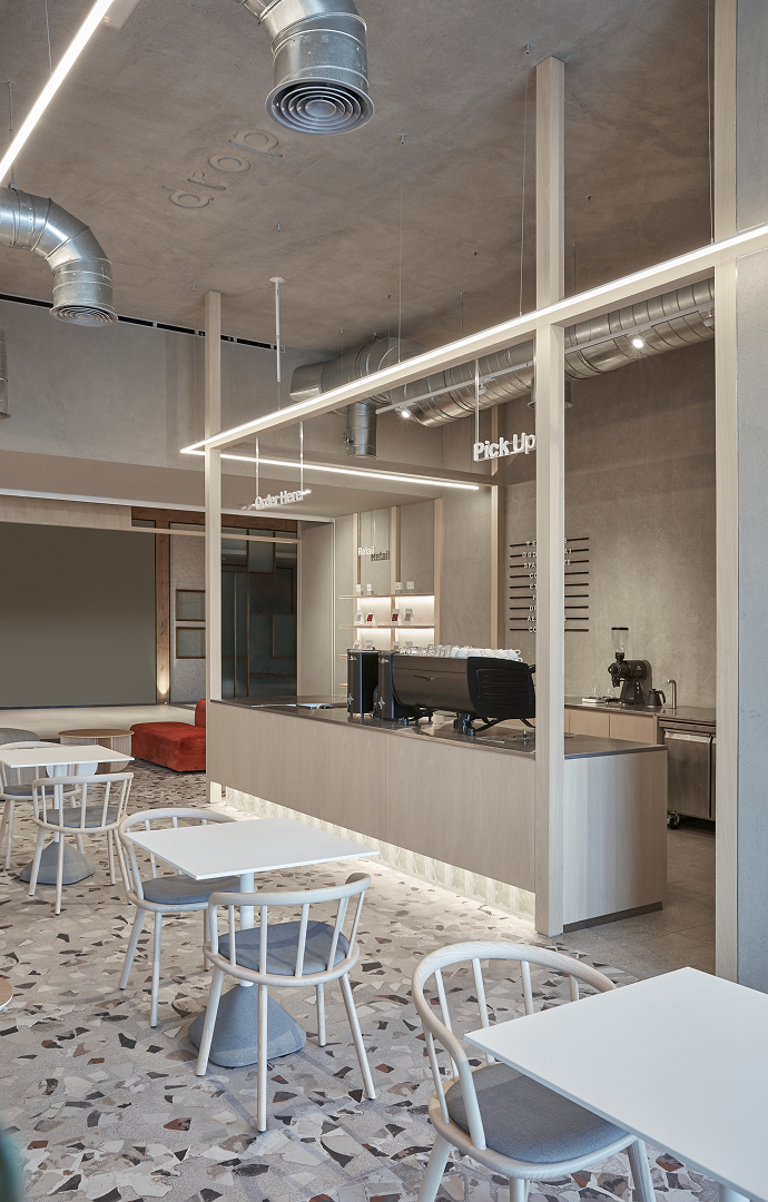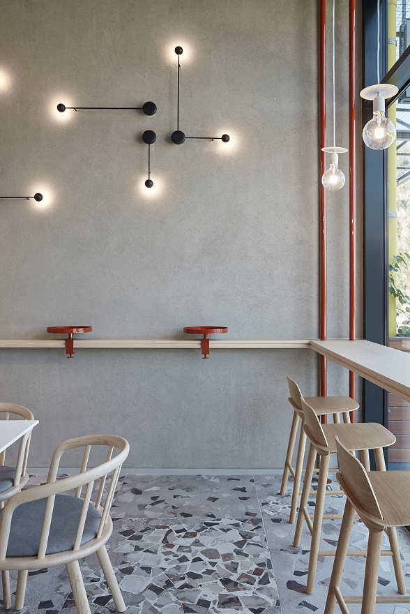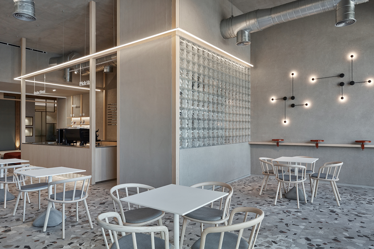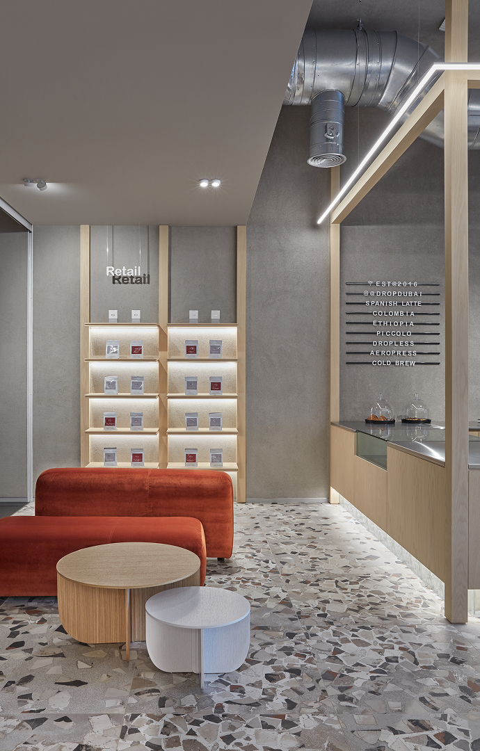 The colour palette was guided by the roasting process of the coffee beans. The terrazzo effect tiles include mixed-tones of rusted brown and dark terracotta while the dominant hues of the scheme, consisting of a very light oak wood coupled with a concrete paint finish, serve as a calming backdrop.