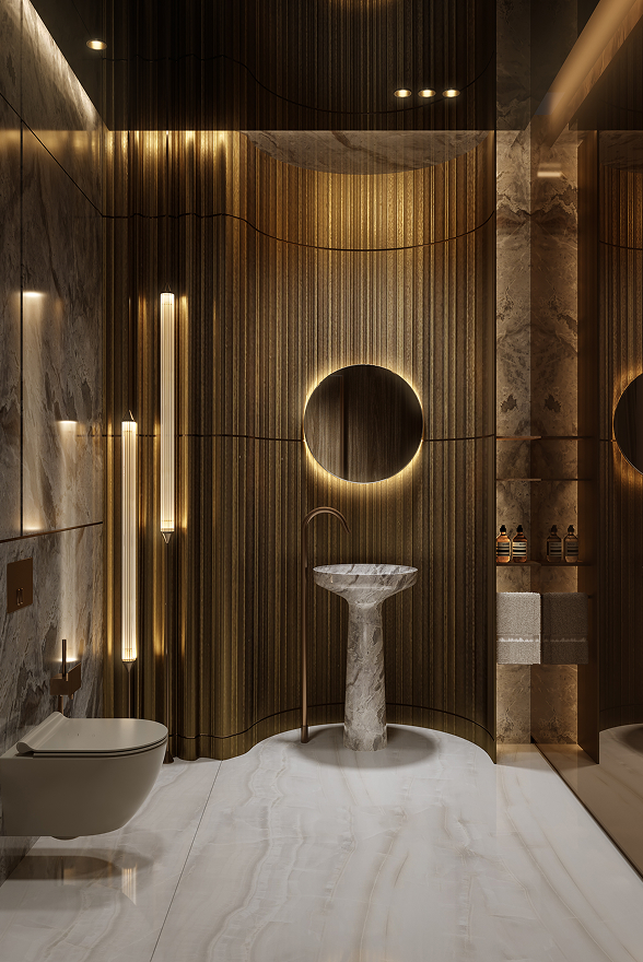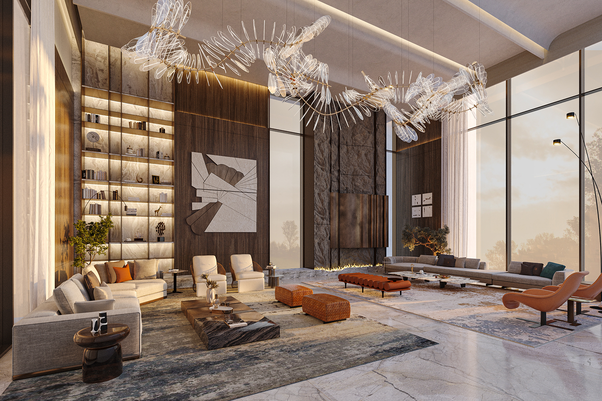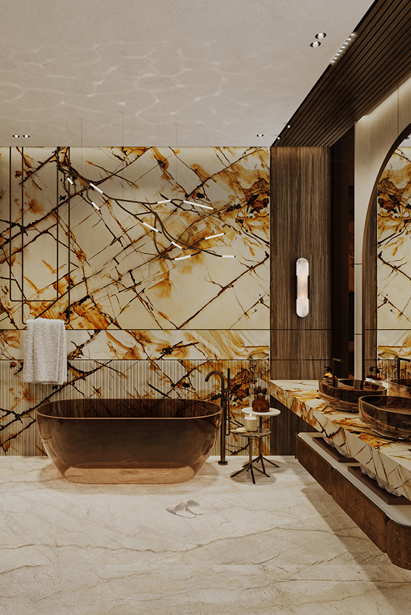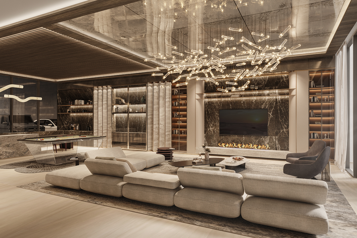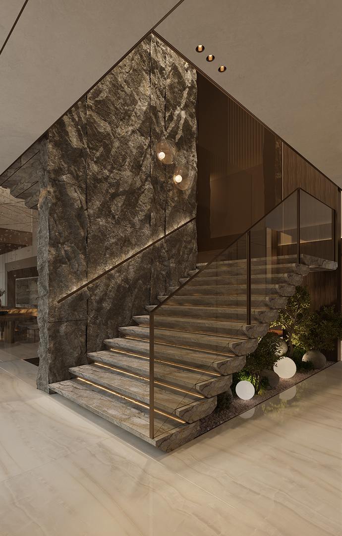 Sculptural elements, from the monolithic stone table to the cascading chandelier, create a focal, gallery - like composition. Layered materials and precise detailing establish a calm yet luxurious atmosphere rooted in balance and proportion.