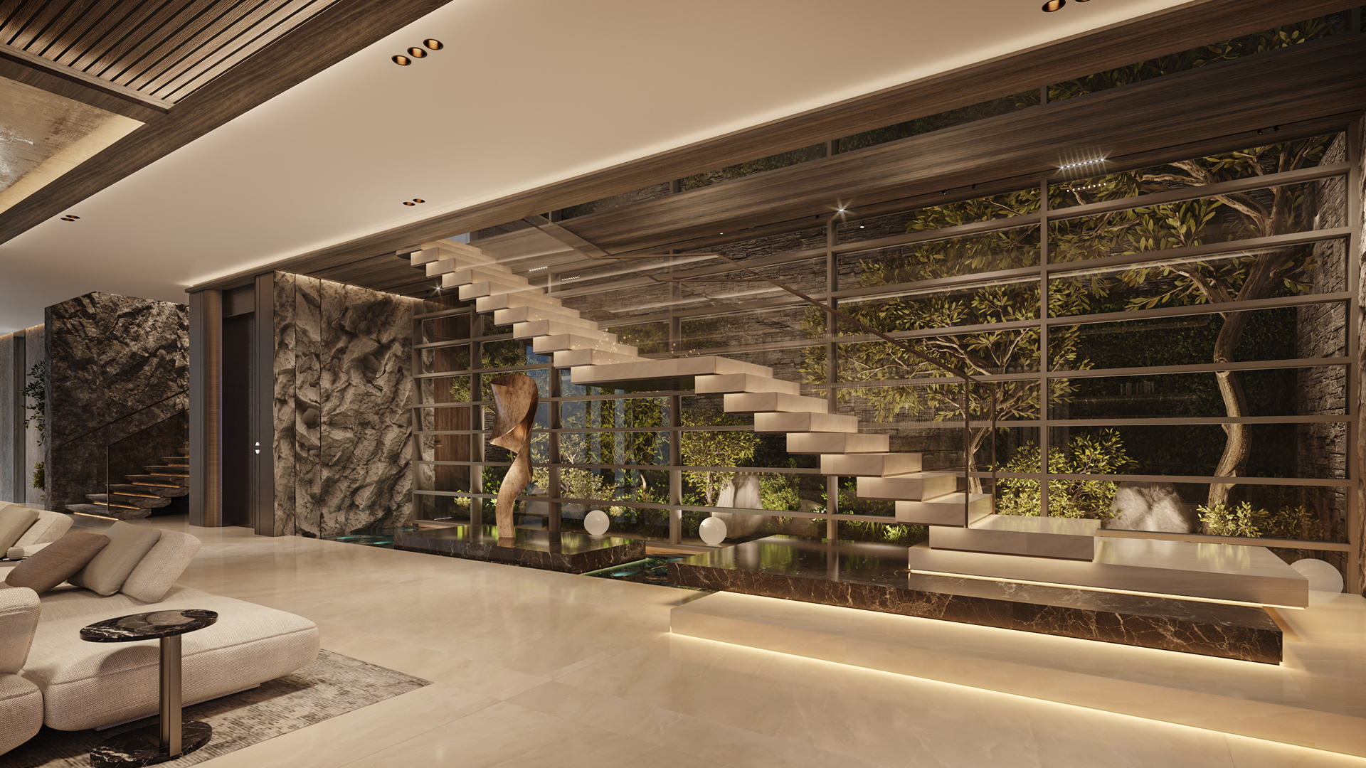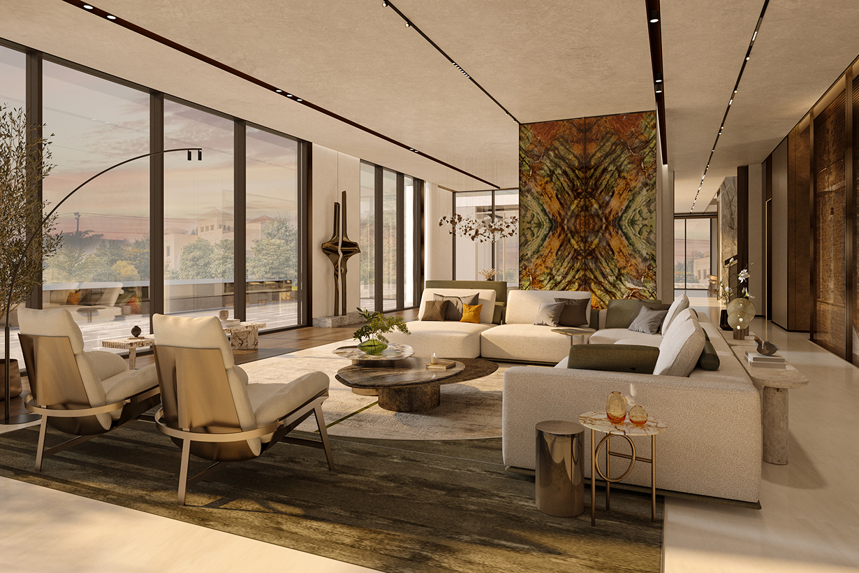 A space defined by warm neutrals, natural stone, and refined timber detailing. Floor - to - ceiling glazing floods the interior with soft daylight, enhancing the sense of openness and verticality.