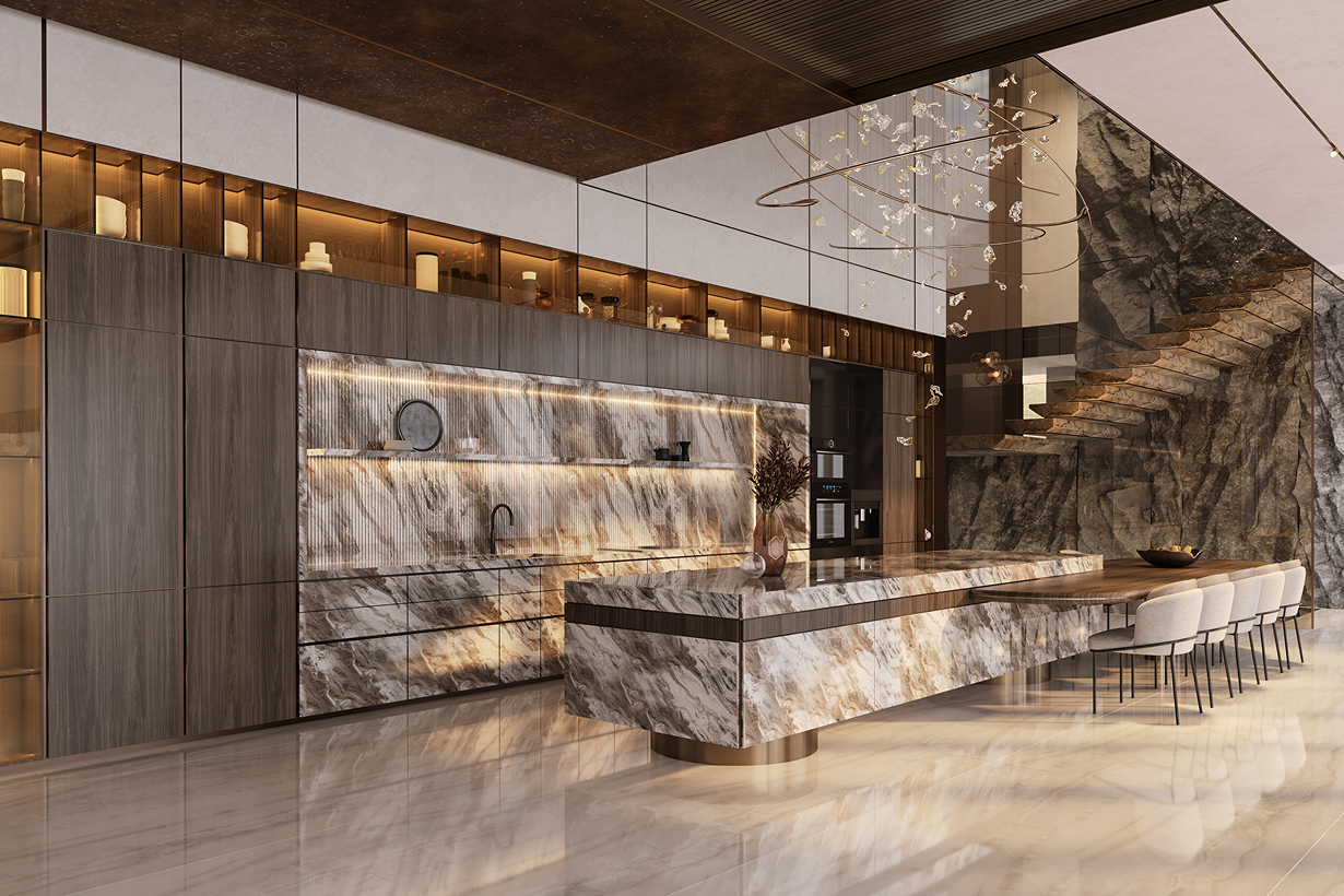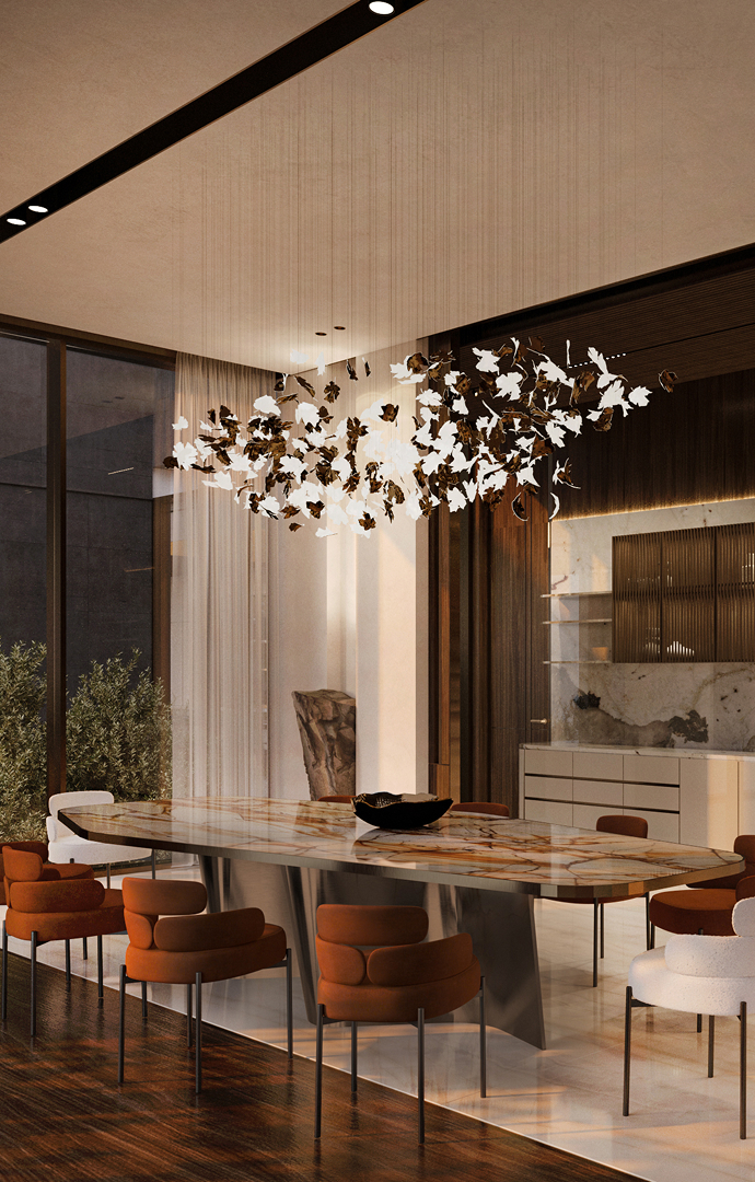 Sculptural elements, from the monolithic stone table to the cascading chandelier, create a focal, gallery - like composition. Layered materials and precise detailing establish a calm yet luxurious atmosphere rooted in balance and proportion.